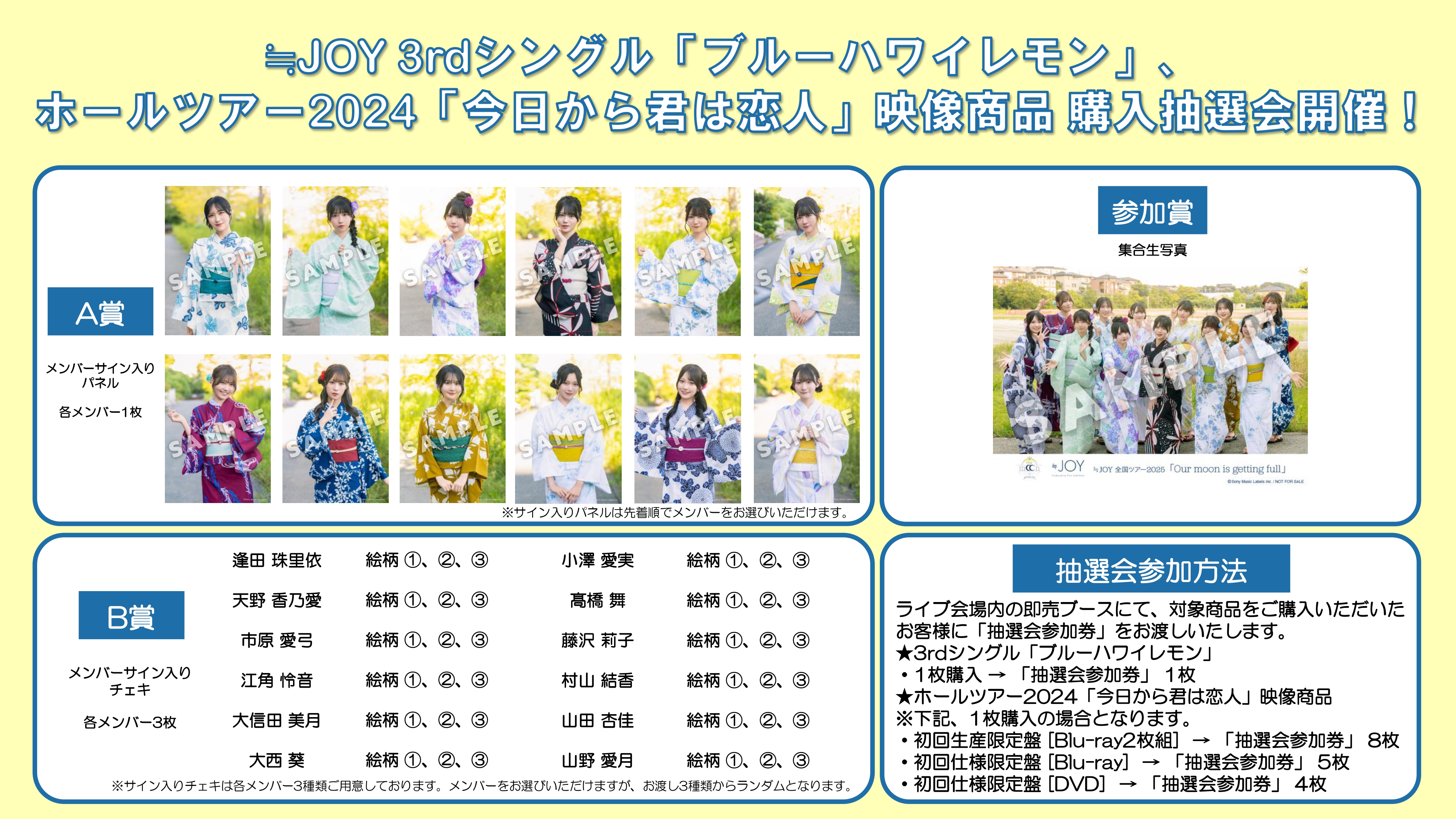 上記会場内の即売ブースにて、2025年6月11日(水)発売の≒JOY 3rdシングル「ブルーハワイレモン」 をご購入いただいたお客様に、CD1枚ご購入につき1枚「抽選会参加券」をお渡しいたします。