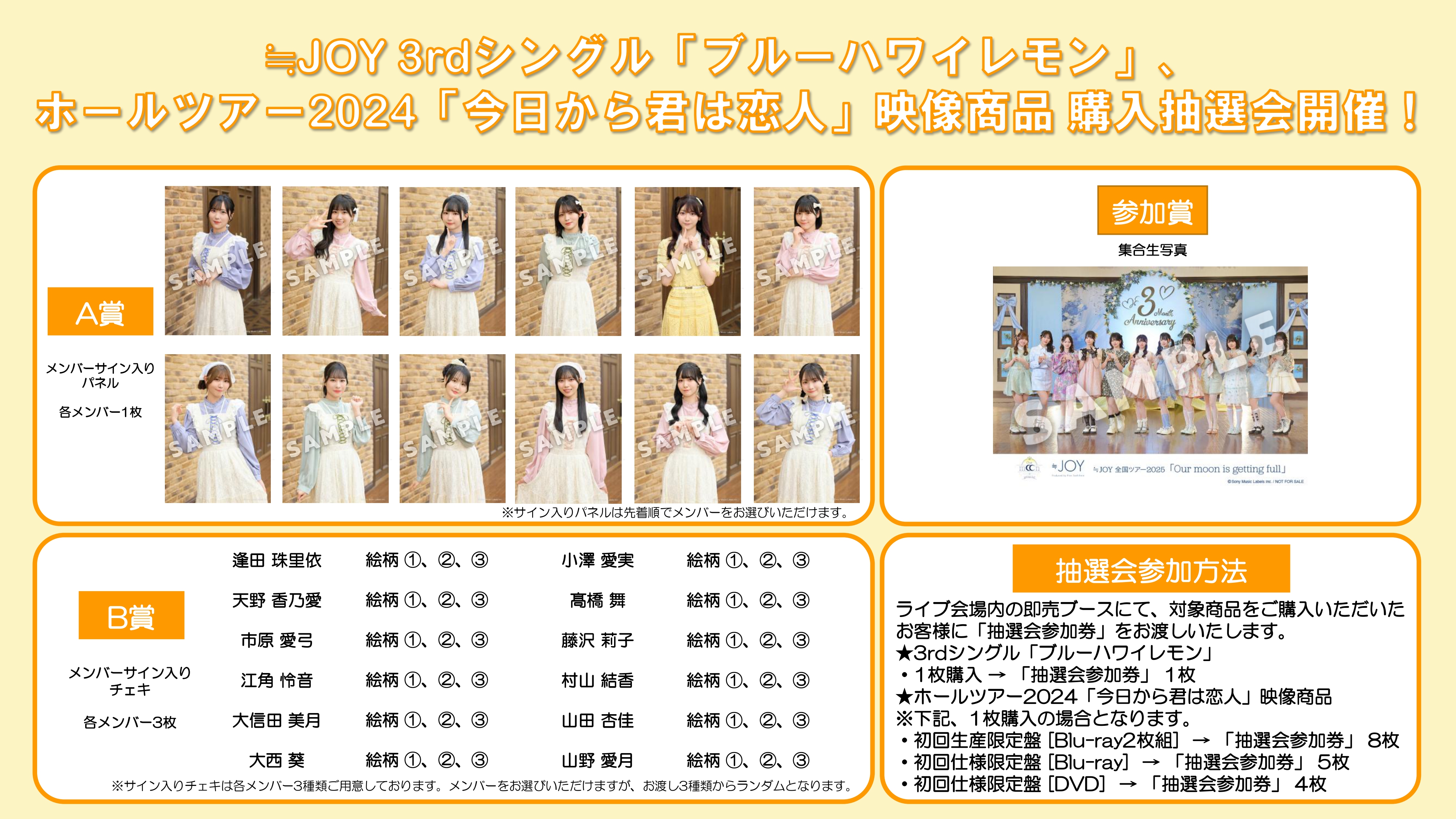 上記会場内の即売ブースにて、2025年6月11日(水)発売の≒JOY 3rdシングル「ブルーハワイレモン」 をご購入いただいたお客様に、CD1枚ご購入につき1枚「抽選会参加券」をお渡しいたします。