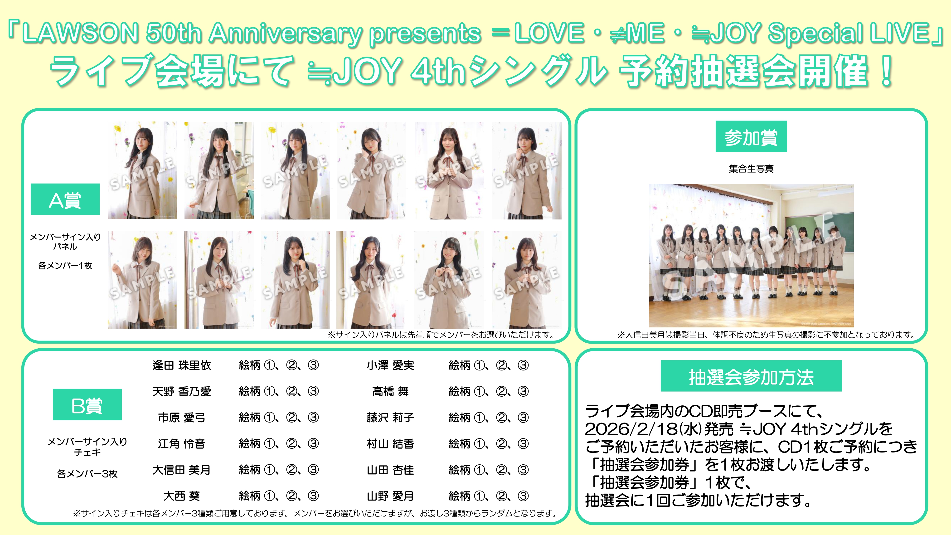 「LAWSON 50th Anniversary presents =LOVE・≠ME・≒JOY Special LIVE」ライブ会場にて、≒JOY CD予約抽選会開催決定!